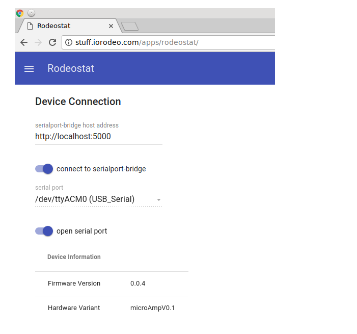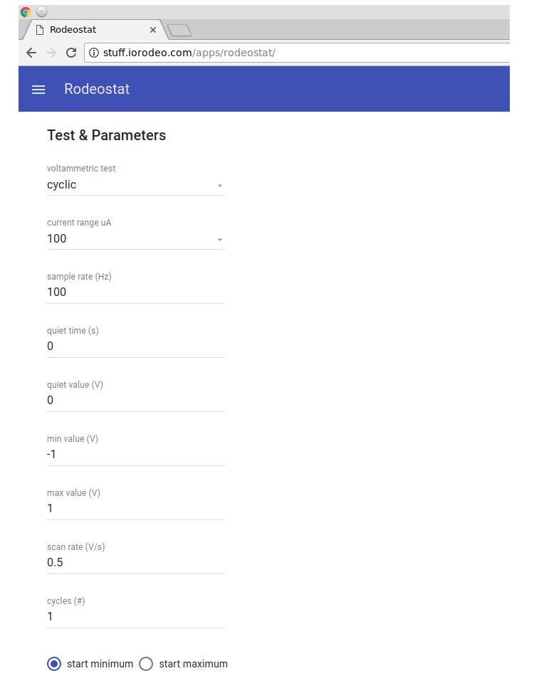 - The Rodeostat Web App software. This software runs entirely in the web browser and is written in Javascript. It provides an intuitive graphical user interface with enables users to set test parameters and acquire, visualize and save data.