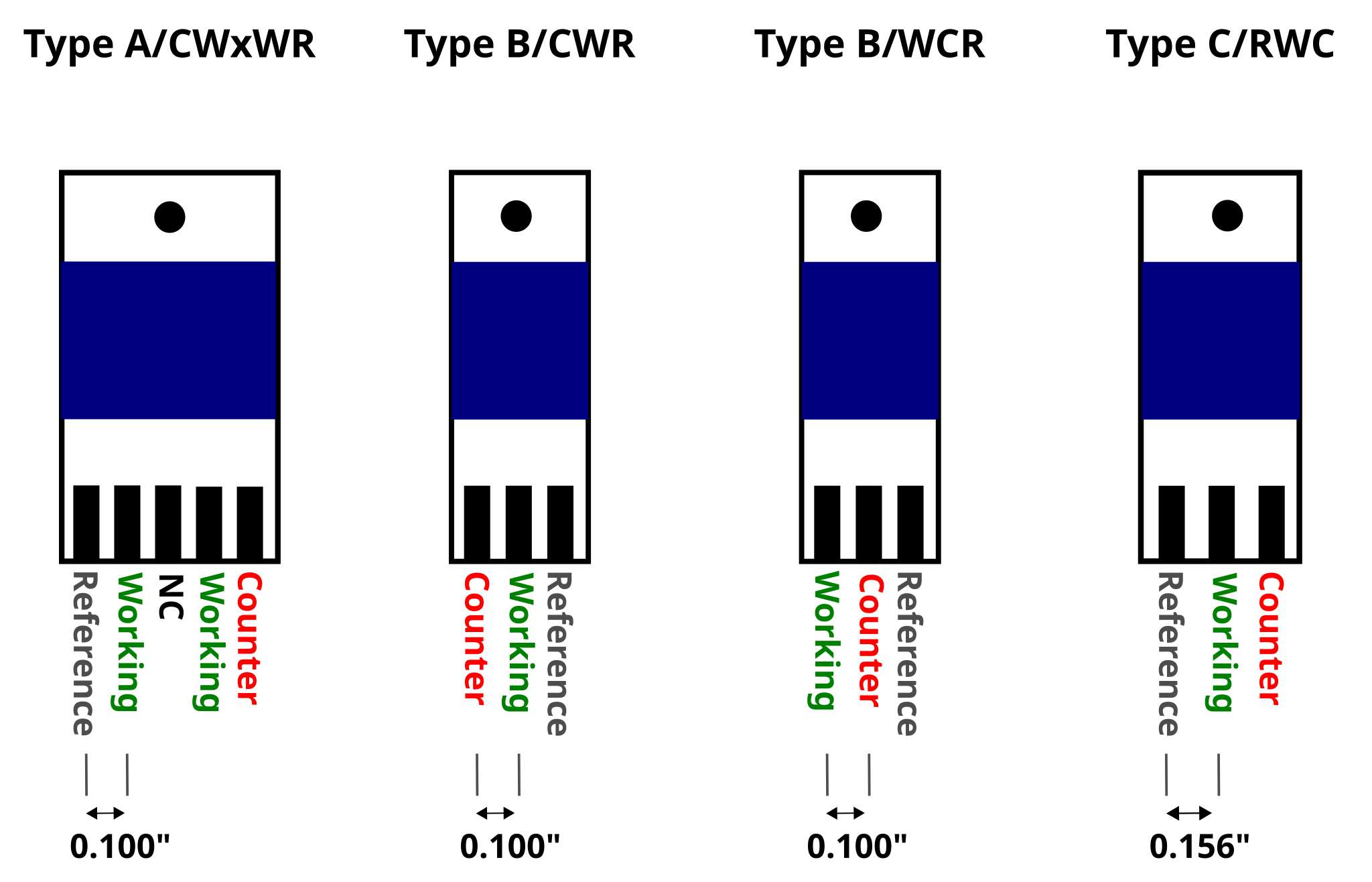 - Type C/RWC - 3-position card edge connector with 0.156" spacing. Suitable for using with any screen printed electrodes with a Type C R/W/C configuration e.g. Zensor screen printed cards sold by CH Instruments.