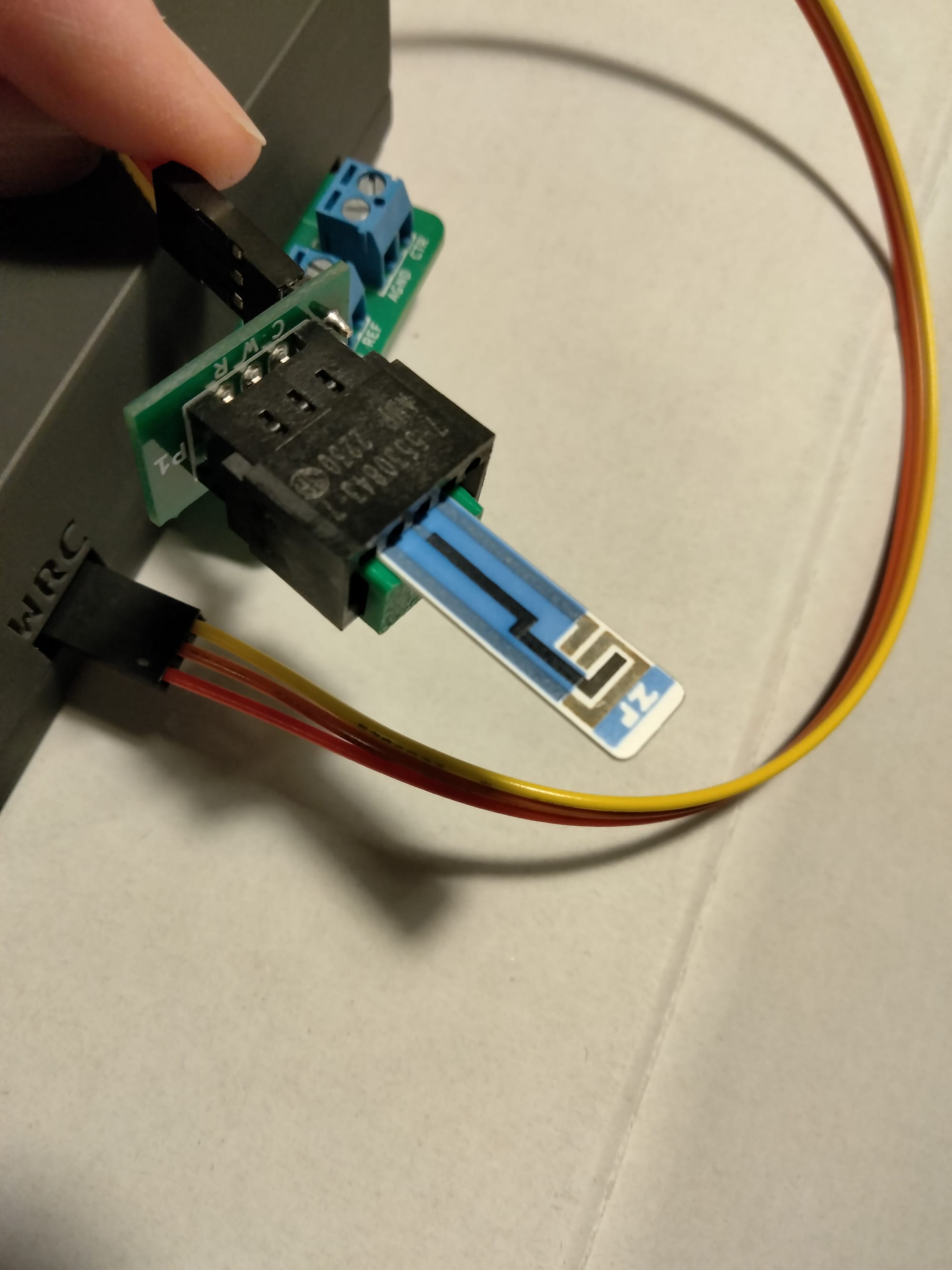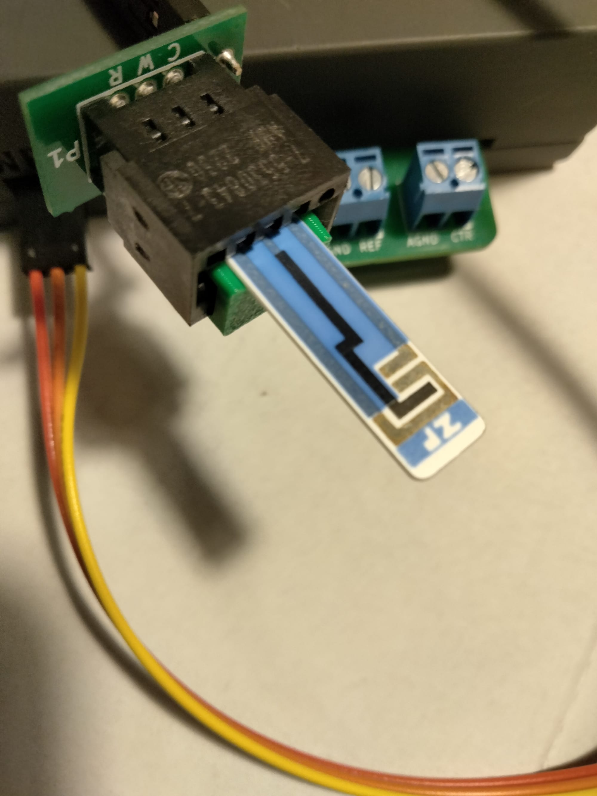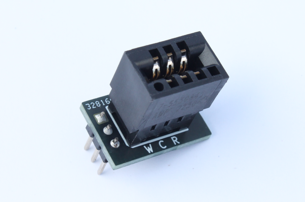 - Orient the adapter so that the PCB lettering (CWR) is at the top. Insert the electrode in as shown in the images. The black adapter body has some manufacturer lettering, but don't use this to identify orientation, just the green PCB.