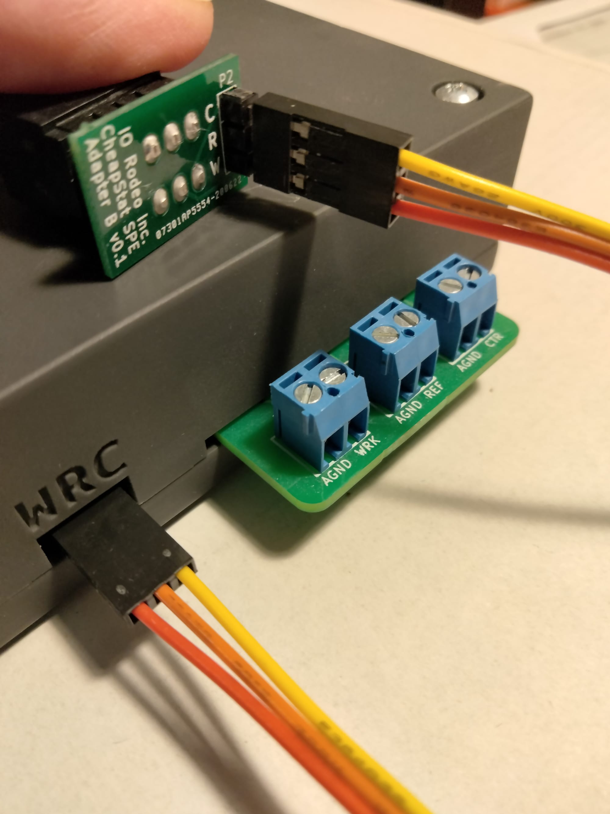 - Make sure the 3-pin cable is connected correctly. In the images you can see the Red wire is connecting the Working electrode between the adapter and Rodeostat, Orange is connecting Reference and Yellow is connecting Counter.