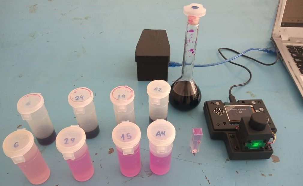 We measured the absorbance from four 2.5g air dried soil samples after its reaction with KMnO4. The amount of oxidized carbon is a function of the amount of KMnO4. This means that for greater amounts of POXC the less the color intensity and absorbance. Samples were taken from two different farms in the Valle de Uco region.