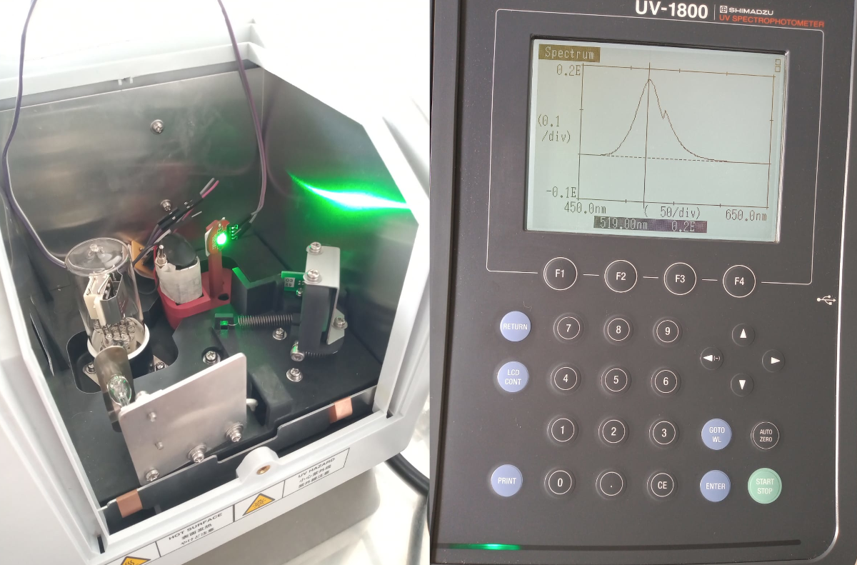 To measure the absorbance of the calibration curve dilutions and the soil samples we used the IO Rodeo colorimeter and two self built colorimeters based on the previous old version of IO Rodeo. The measurement protocol suggest a 550nm light source, however we did not have LEDs emitting in that wavelength. We used the 520nm led for the IO Rodeo colorimeter and the green light of an RGB LED for the other two colorimeters. To know the emission spectrum and peak emission of those green LEDs we tested them on a commercial UV1800 Shimadzu UV-VIS spectrophotometer. You can find more details of the LED emission test here.