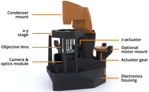 3D-printed microscopes are a great tool in science education allowing students to print, build and customize an affordable microscope. Access to a fully-automated, research-grade microscope is also important in clinical and research lab settings. This is especially true in locations where there are sometimes significant barriers to accessing affordable scientific instruments. This is highlighted by the collaborative work in Tanzania where the OpenFlexure microscope is currently undergoing trials for malaria diagnosis.