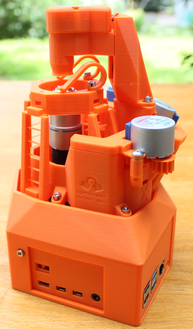 We used our Bambu Lab X1 Carbon 3D printer for all of the 3D printed parts. We used orange PLA basic filament (which we had in stock) for all of the microscope parts except for the Optics Module which must be printed in black. In total we used 360g of orange PLA filament and 11g of black PLA filament. Total print time was around 12 hours.