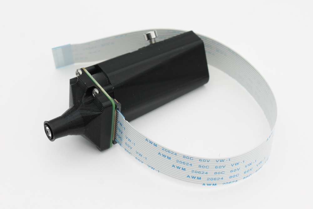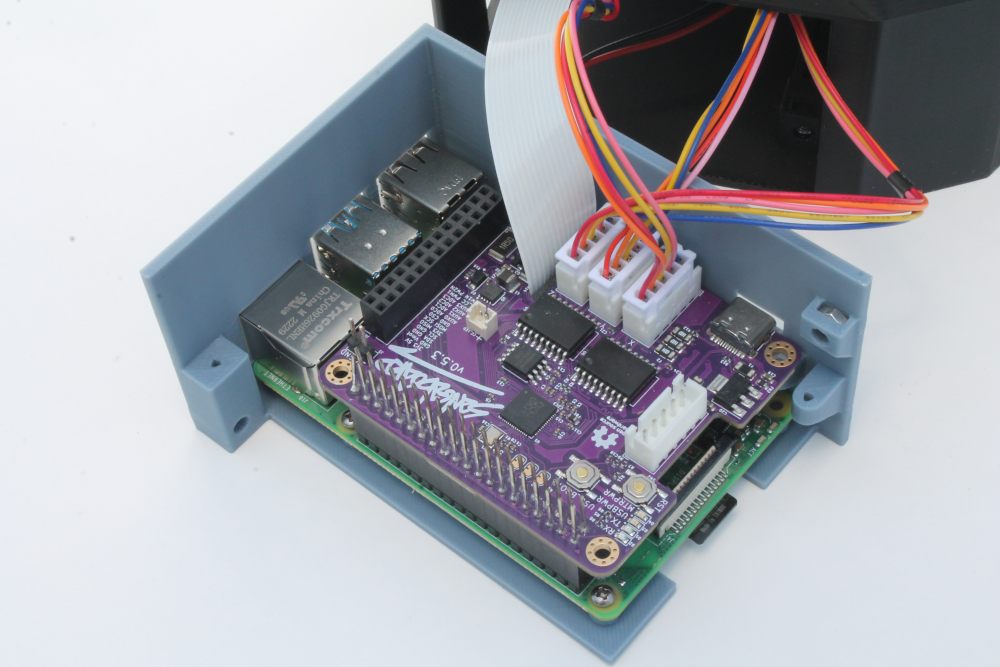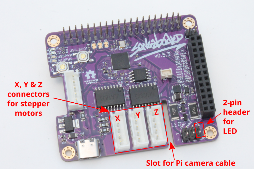 The Sangaboard mounts directly onto the Raspberry Pi GPIO 40-pin header. The camera cable passes through a slot in the Sangaboard.