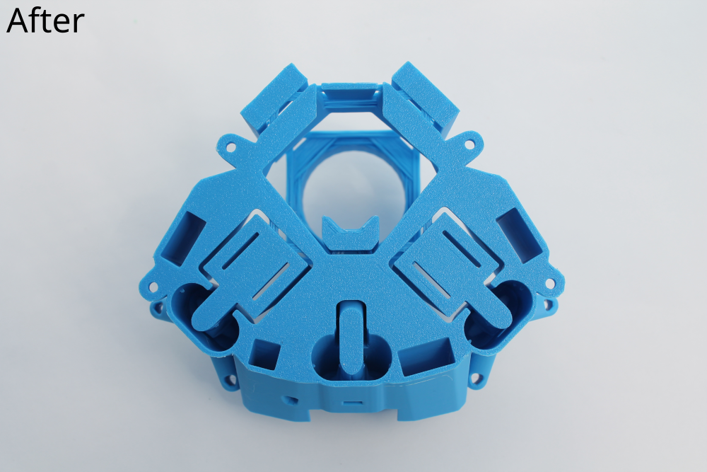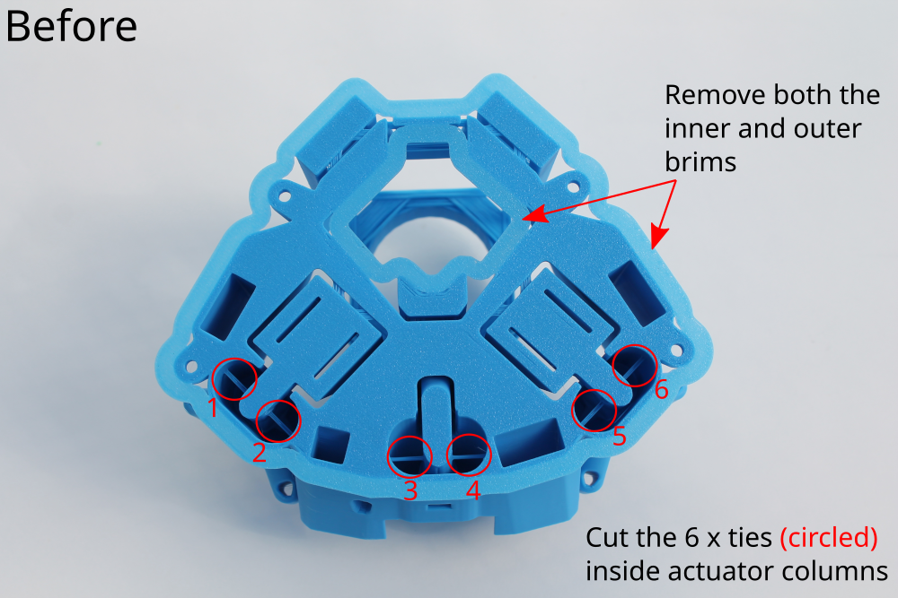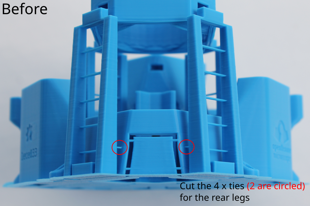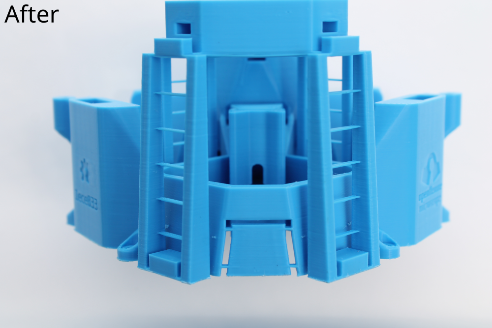 In the before images you can see how the main body arrives in the kit with the brim and support ties. The after images show how the part will look after you have trimmed and removed the brim and support ties.