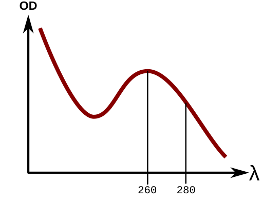 Nucleic acids have a specific UV absorbance peak due to the conjugated double bonds in the nucleotide bases (purine and pyrimidine rings) which have a specific absorption peak at 260nm. From the literature, we know the average molar extinction coefficient for double-stranded DNA at 260nm is 0.020 (μg/mL)−1 cm−1.
