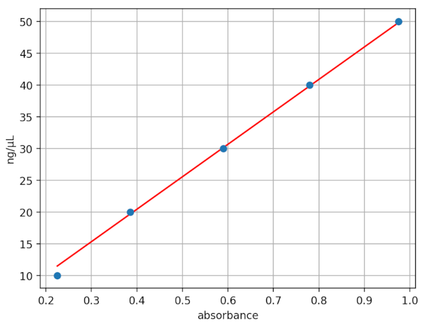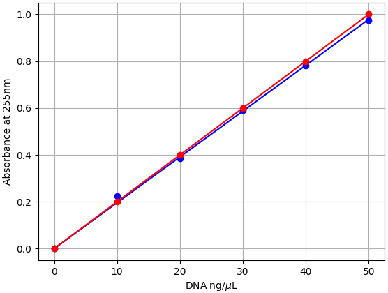 We characterized dsDNA absorbance with the Open Colorimeter at 255nm (A255) as described in the Supplemental Information at the end of this post. The graph below shows the measured absorbance data using the UV Open Colorimeter and dsDNA standard (blue data) compared to the expected values using the average extinction co-efficient for dsDNA (red data).