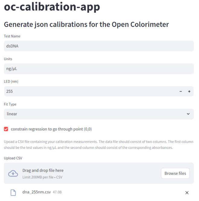 Screenshots from using the oc-calibration-app to generate dsDNA json calibration data
