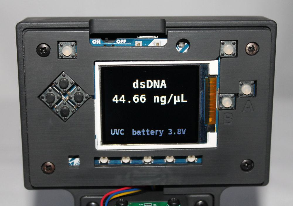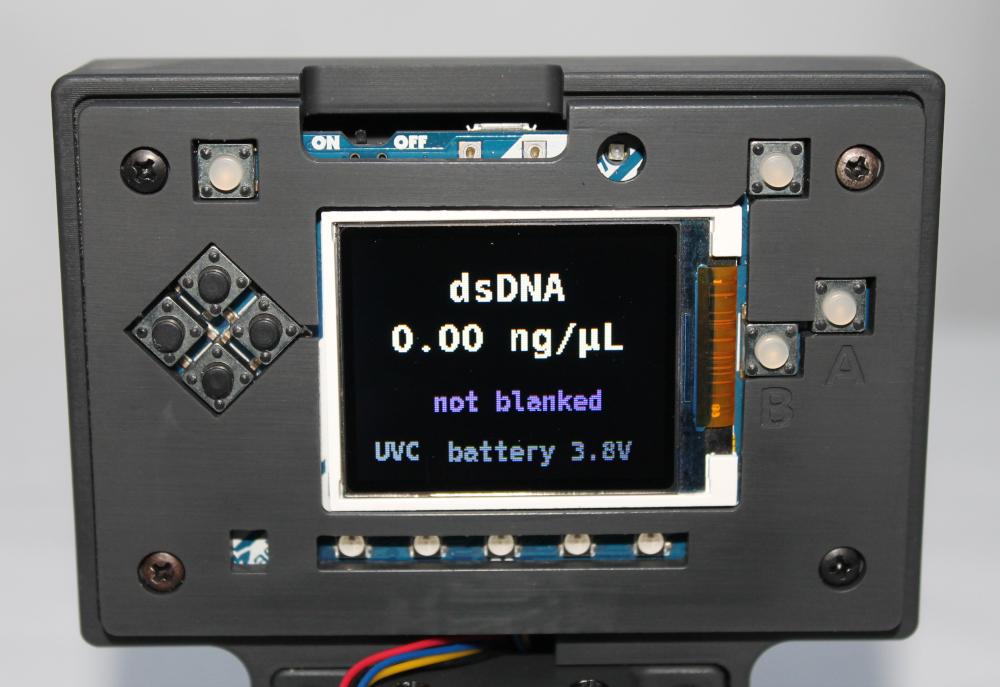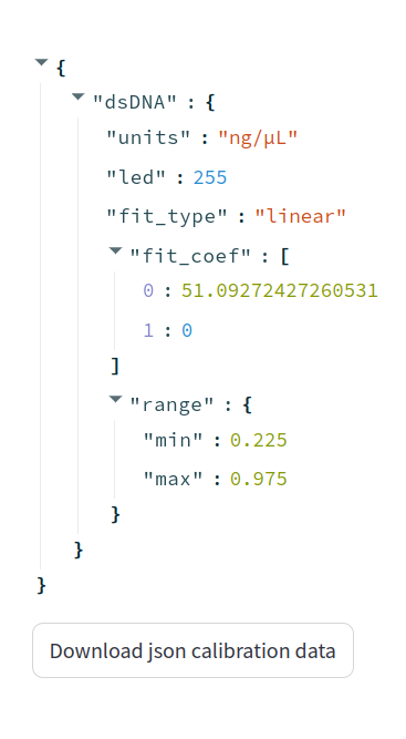 Finally, the json calibration data was downloaded onto installed into the calibration.json on the UV Open Colorimeter firmware. This generates the method on device which is listed as "dsDNA" in the main menu.