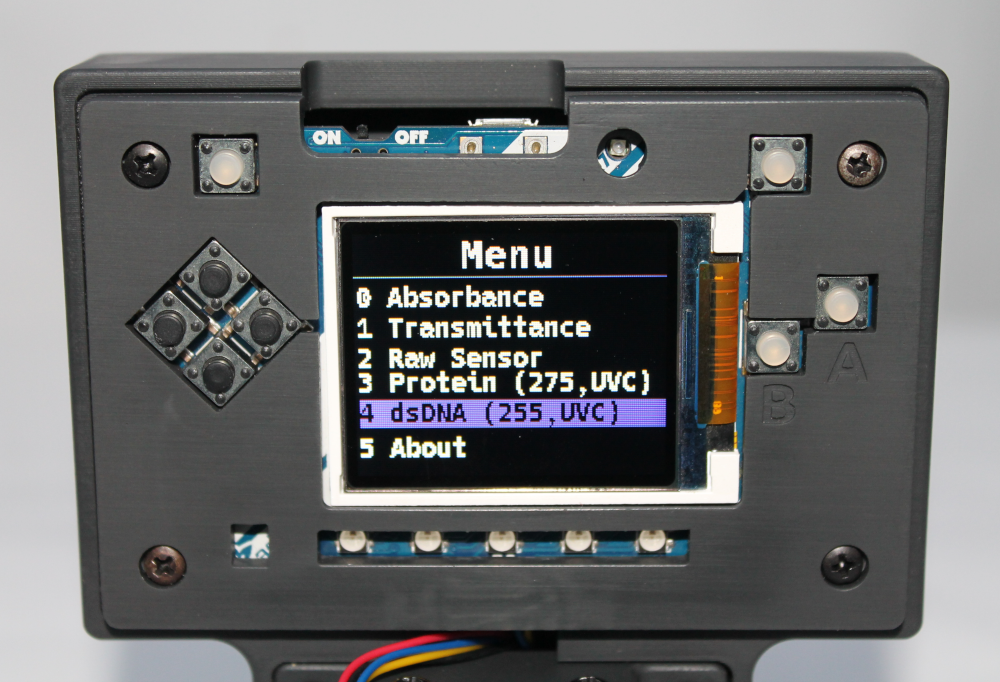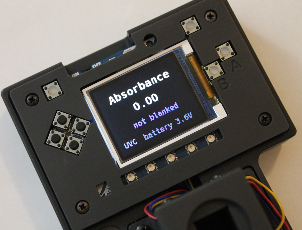 - With the 255nm UV LED installed, switch on the UV Open Colorimeter. After the splash screen, the first screen is the default Absorbance screen as shown below