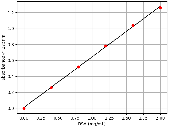 These light wavelengths can be used to study both UV absorbance by proteins and other molecules, as well as used to excite fluorescence. In the tutorial linked below, we used the 275 nm LED and the UV Open Colorimeter UV-C channel to measure absorbance of the standard protein, bovine serum albumin (BSA). We can see a linear relationship between light absorbance and BSA concentration in the Figure below. From our data we also calculated the molar extinction coefficient of BSA with the UV Open Colorimeter.