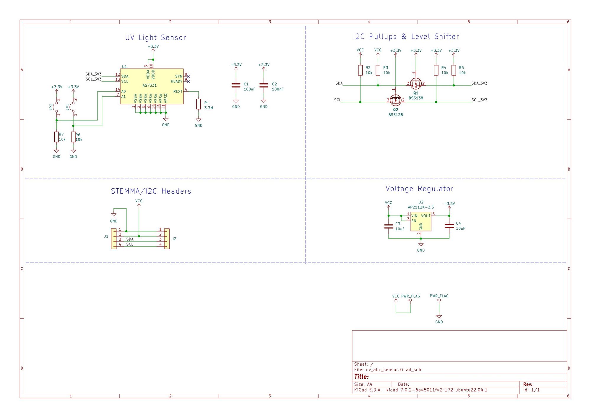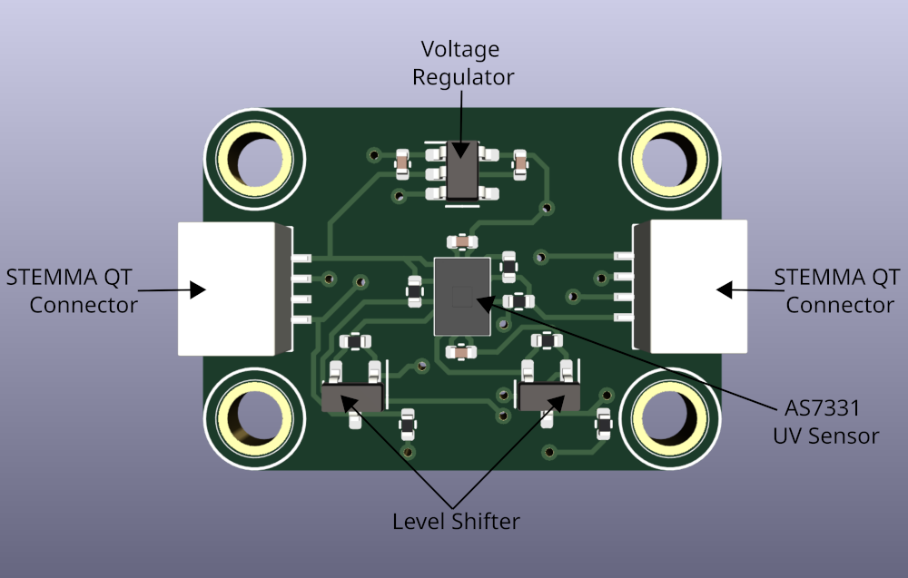 We designed the PCB to be compatible with the Open Colorimeter so it can be easily swapped out to replace the current Adafruit TSL2591 visible light sensor with the UV version. We used the same 1.0 x 0.7 inch PCB dimensions, same mounting holes, STEMMA QT connectors and light sensor location. The board can be operated from 3.3-5V and contains an on-board 3.3V regulator. The device IC2 address can be adjusted via 2 jumper pads located on the back side of the PCB (in case of address conflict).